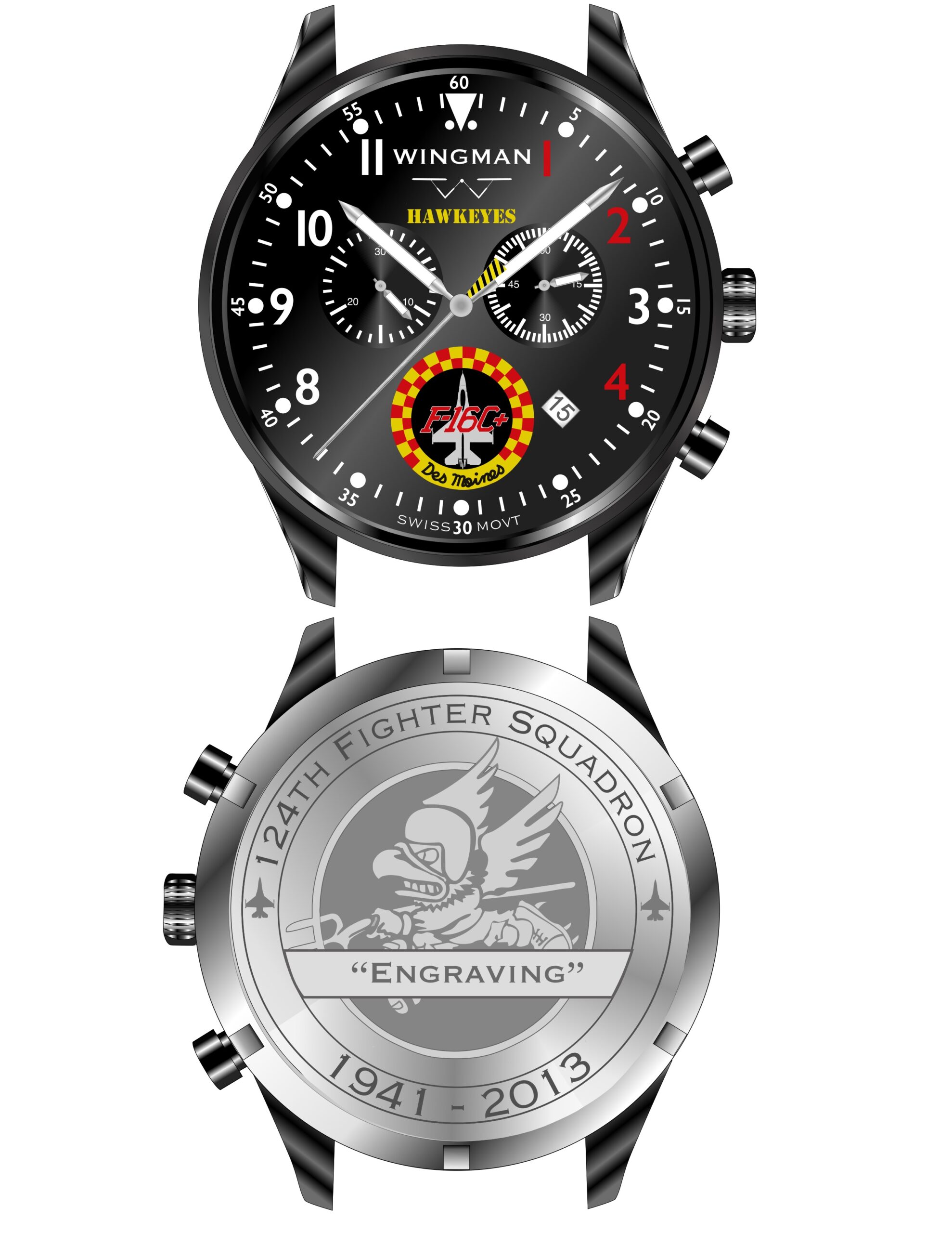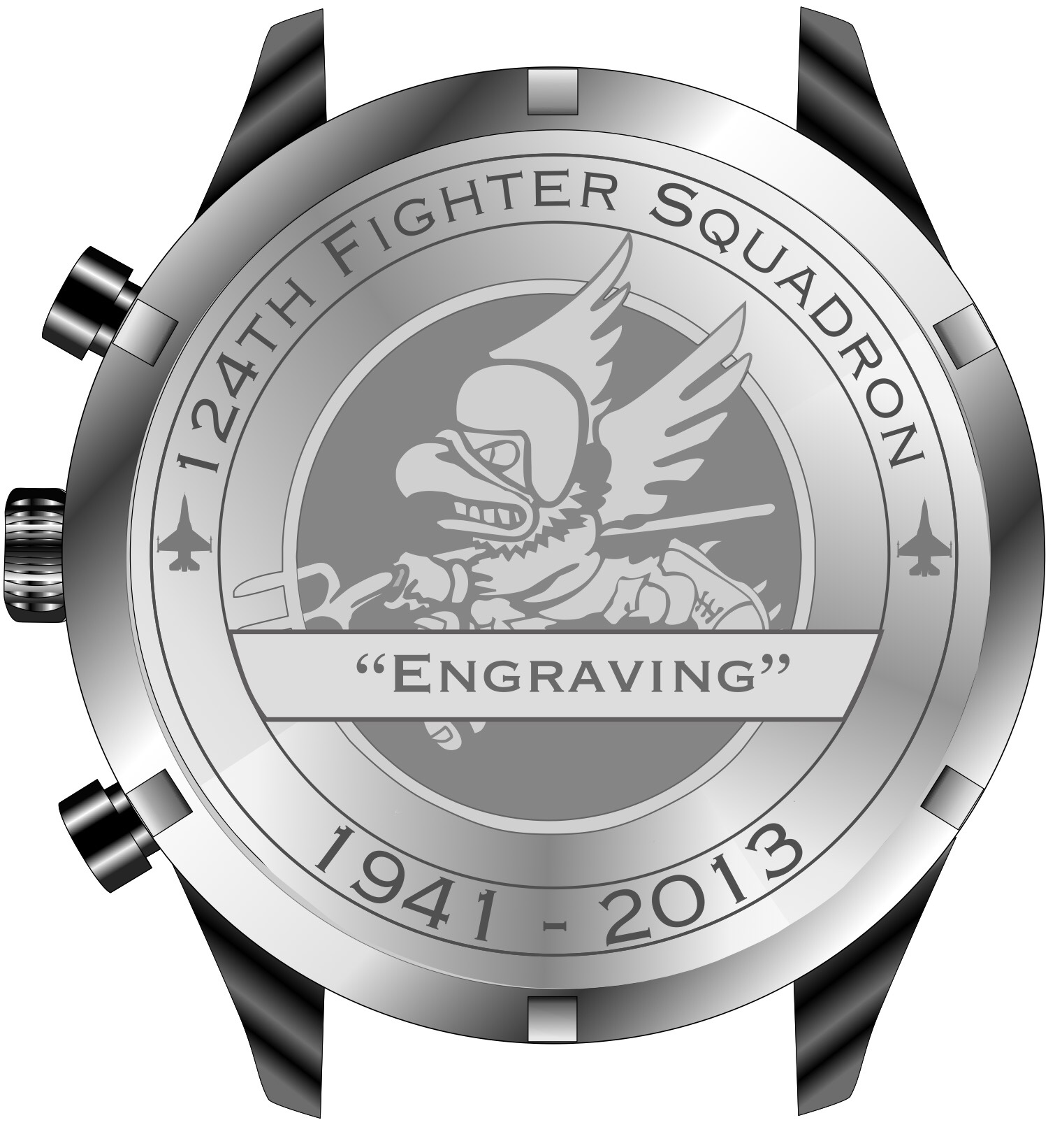 Caseback Orientation:  Please note that the caseback “design” pictured in this gallery is oriented exactly in line with the watch face for presentation purposes only.  During production, the caseback is a separate piece of the watch.  When the casebacks are engraved with the airframe design, they are not attached to the rest of the case at that time.  Since both the casebacks and cases are threaded separately, when the engraved caseback  is then screwed onto the case, the final tightening point will result in the caseback design not being in the exact orientation in relation to the watch face.  And there will be some variation from watch to watch.