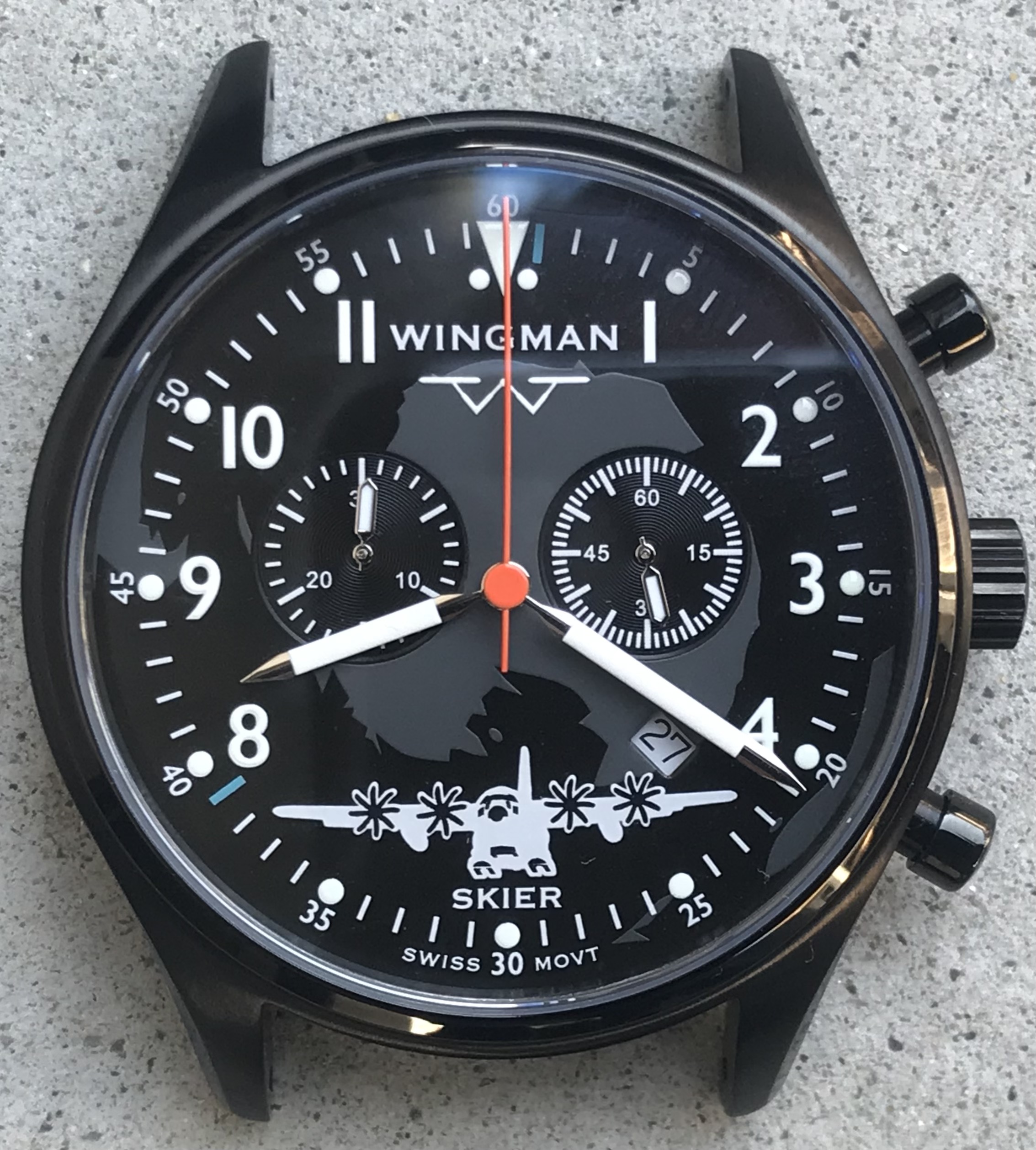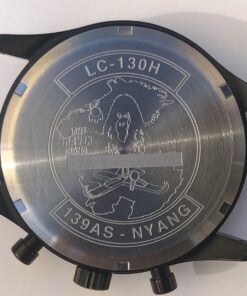 Caseback Orientation:  Please note that the caseback “design” pictured in this gallery is oriented exactly in line with the watch face for presentation purposes only.  During production, the caseback is a separate piece of the watch.  When the casebacks are engraved with the airframe design, they are not attached to the rest of the case at that time.  Since both the casebacks and cases are threaded separately, when the engraved caseback  is then screwed onto the case, the final tightening point will result in the caseback design not being in the exact orientation in relation to the watch face.  And there will be some variation from watch to watch.