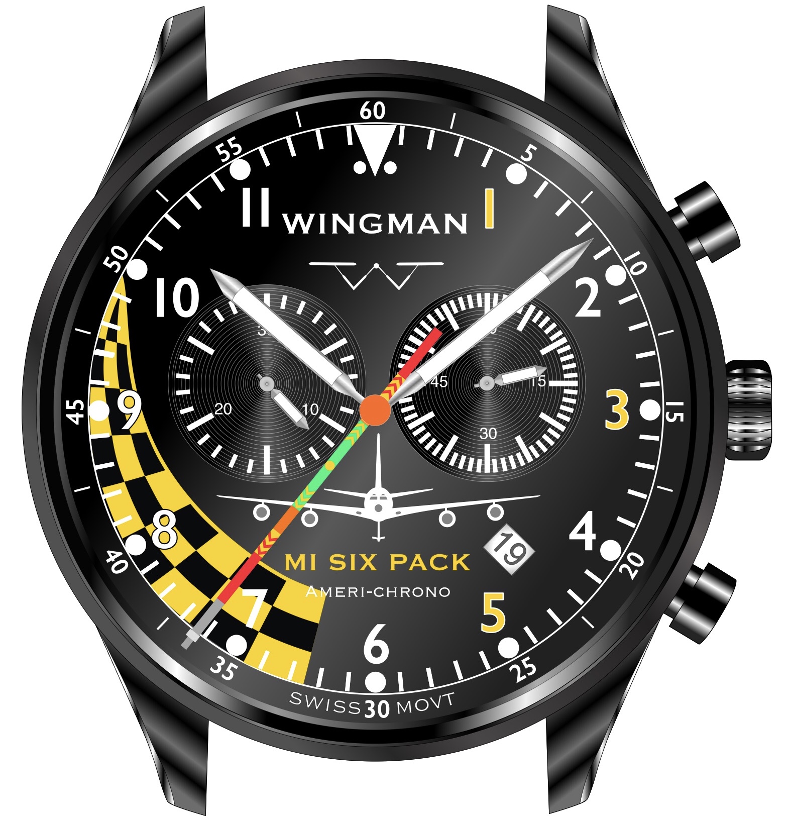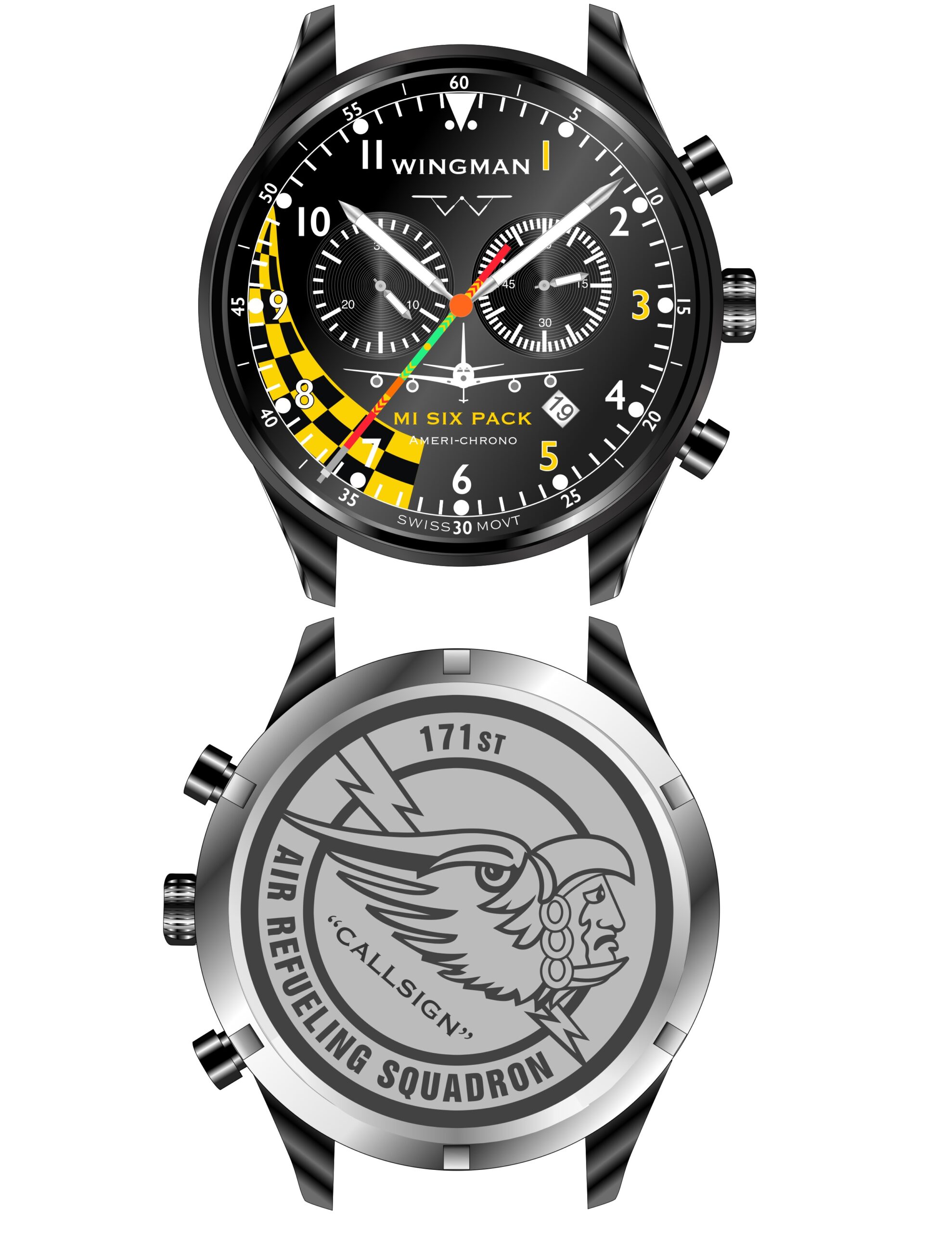 - Our “Americhrono” watch using a high-end Swiss chronograph movement.