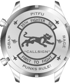 Caseback Orientation:  Please note that the caseback “design” pictured in this gallery is oriented exactly in line with the watch face for presentation purposes only.  During production, the caseback is a separate piece of the watch.  When the casebacks are engraved with the airframe design, they are not attached to the rest of the case at that time.  Since both the casebacks and cases are threaded separately, when the engraved caseback  is then screwed onto the case, the final tightening point will result in the caseback design not being in the exact orientation in relation to the watch face.  And there will be some variation from watch to watch.