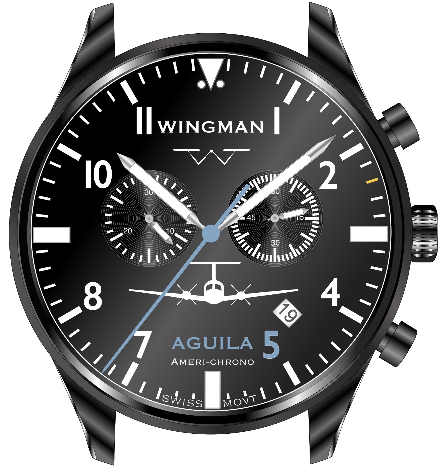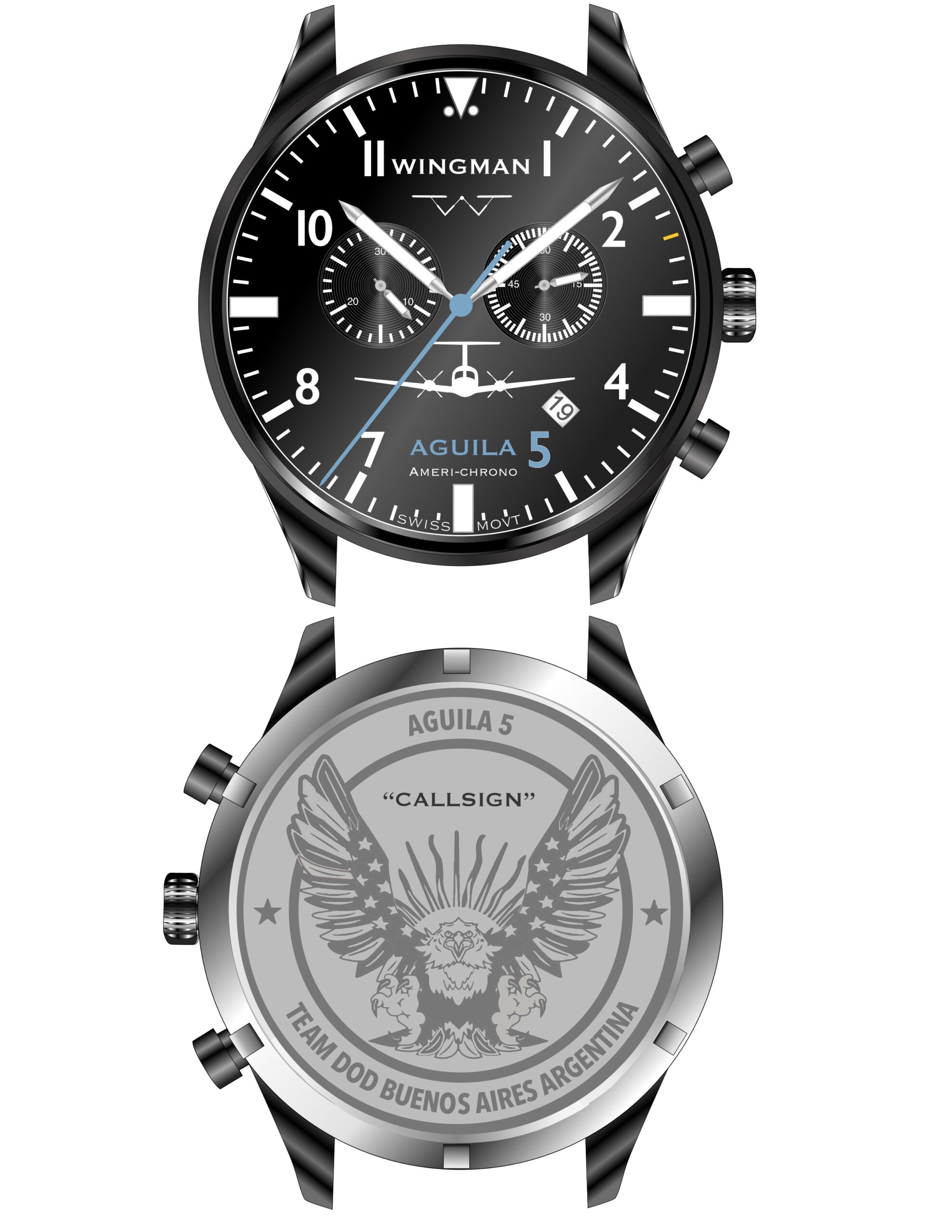 - Our “Ameri-chrono” watch using a high-end Swiss chronograph movement.