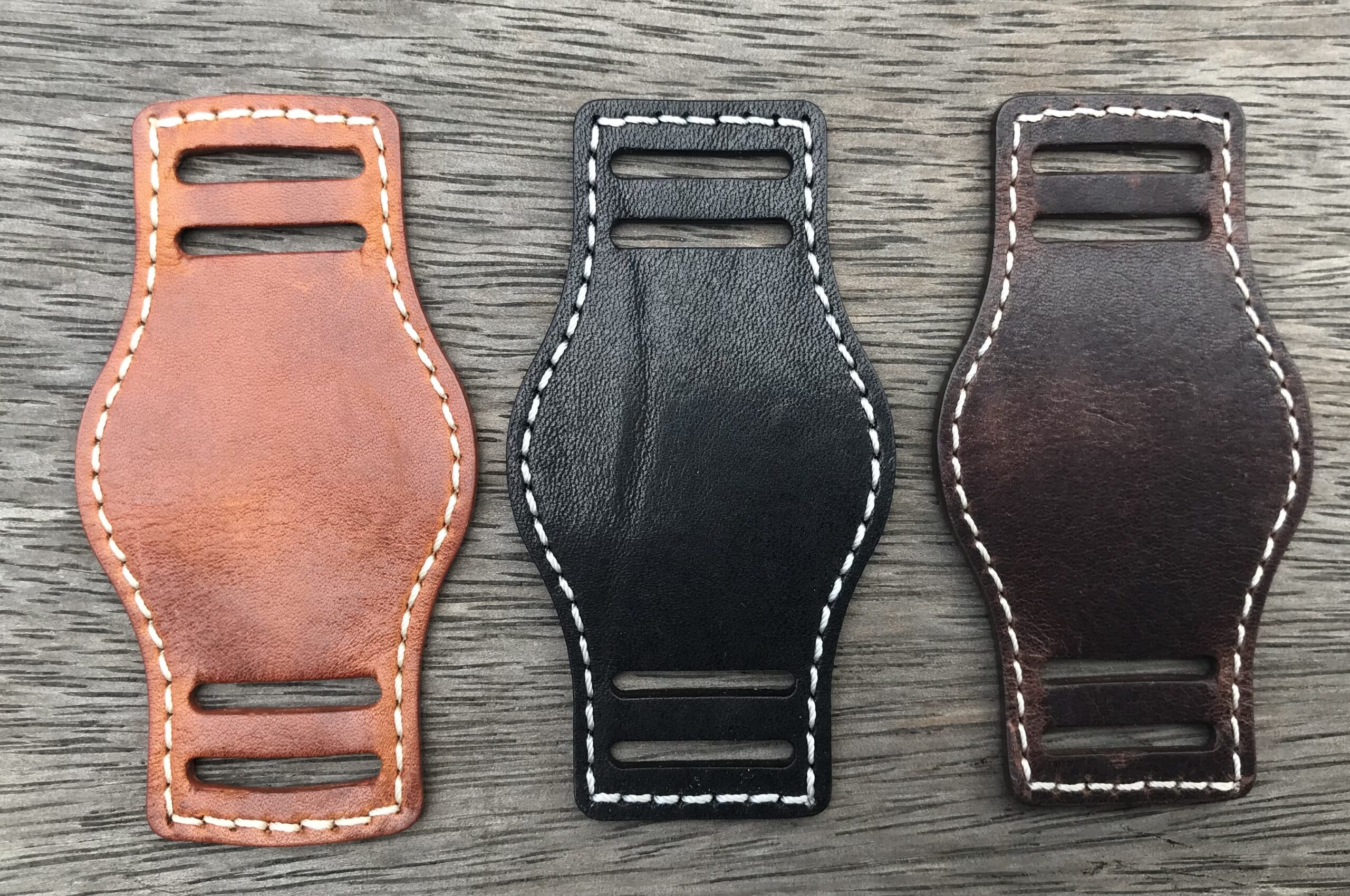These Bund straps are a separate piece that creates a continuous leather contact around your wrist. They pair best with our pilot strap leather (but also work with our padded leather bands) and come in three different colors (Black, Chestnut and Mahogany) with a variety of colored stitching and a reversible side that has the same colored stitching as the band.