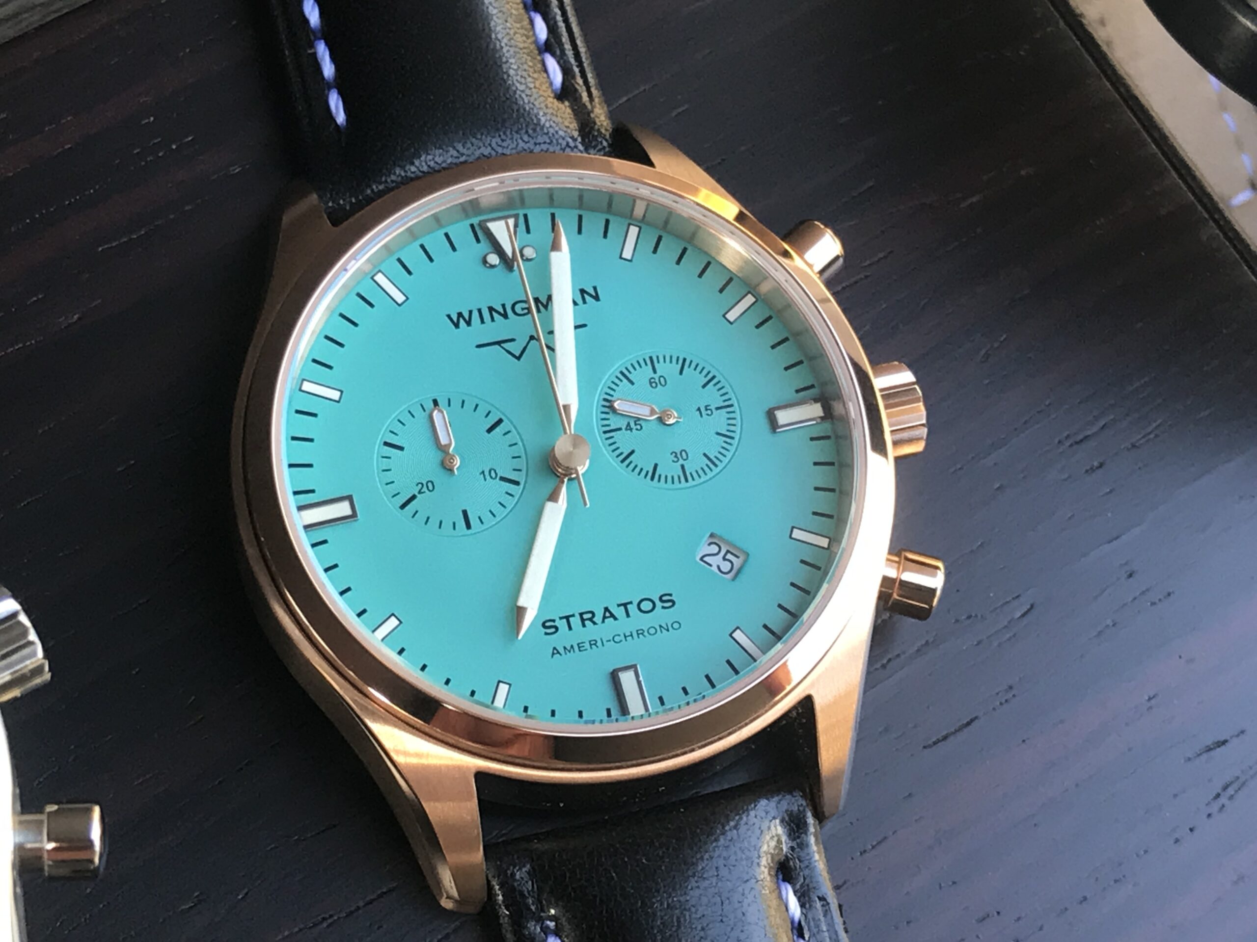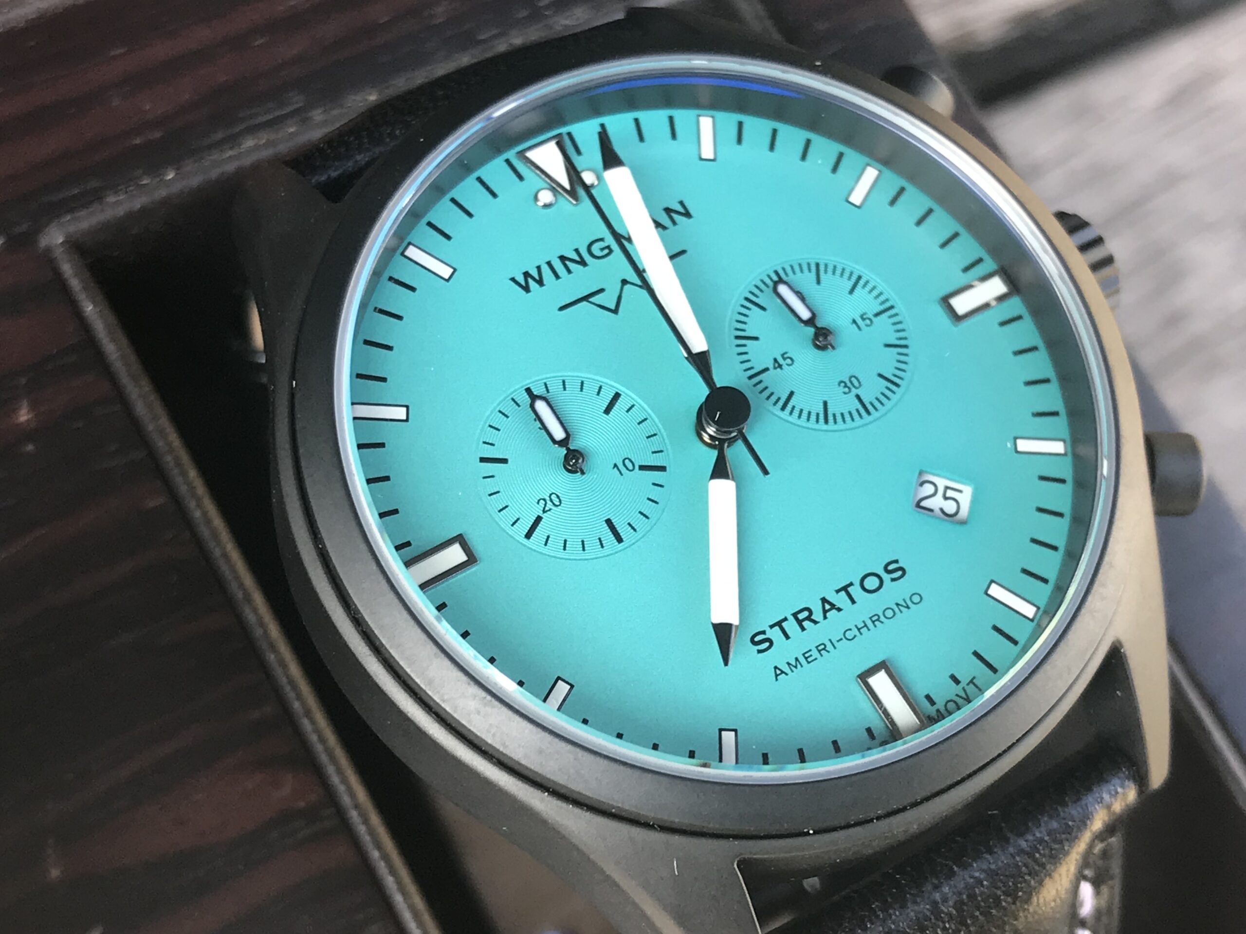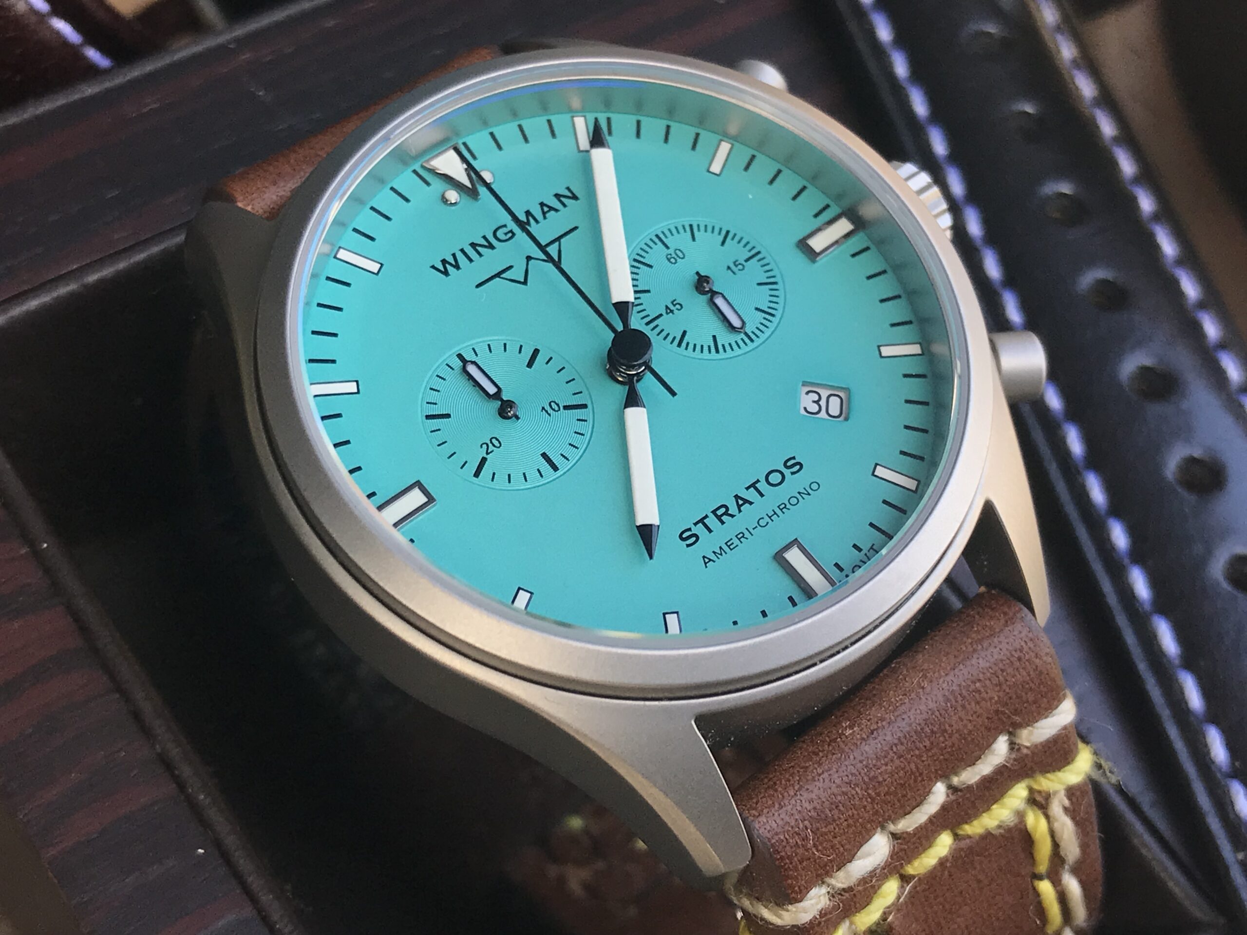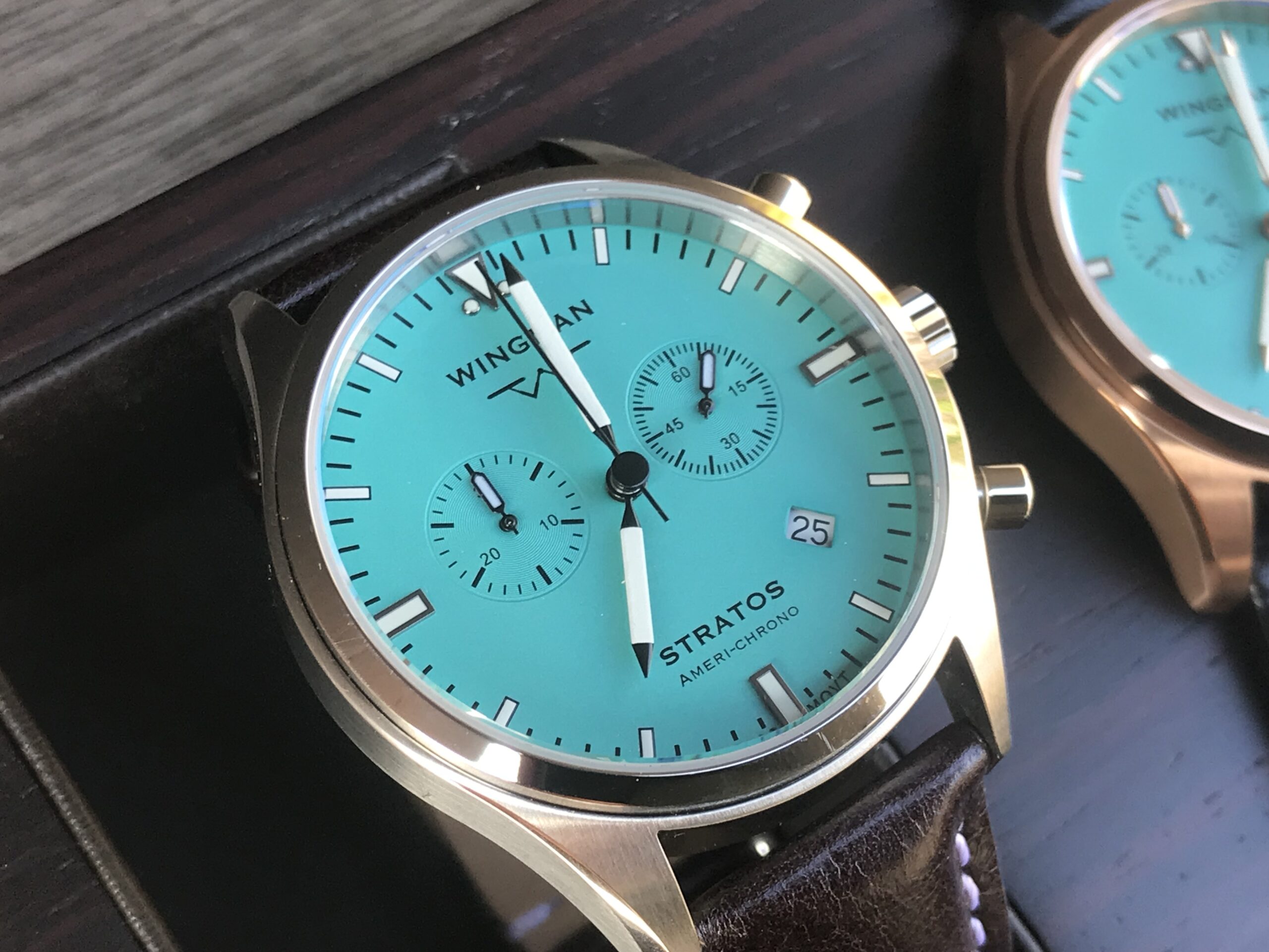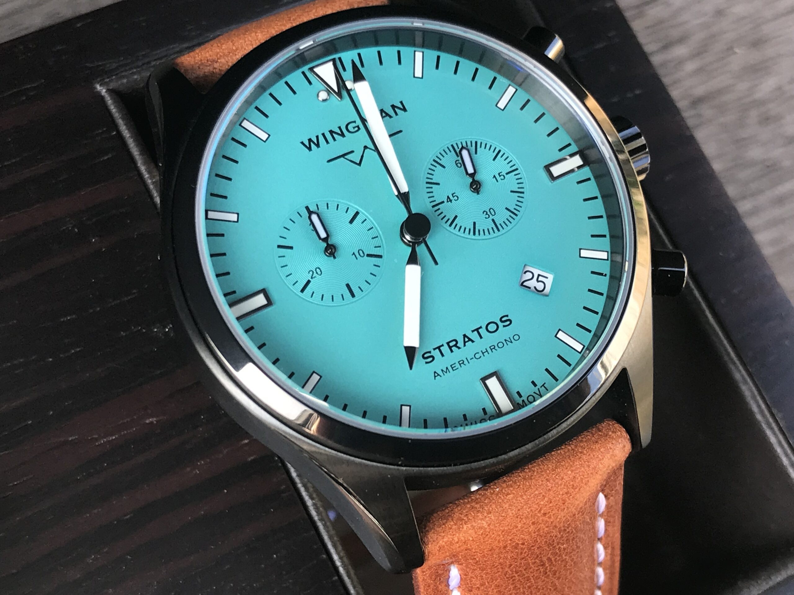 - Our “Americhrono” watch using a high-end Swiss chronograph movement.