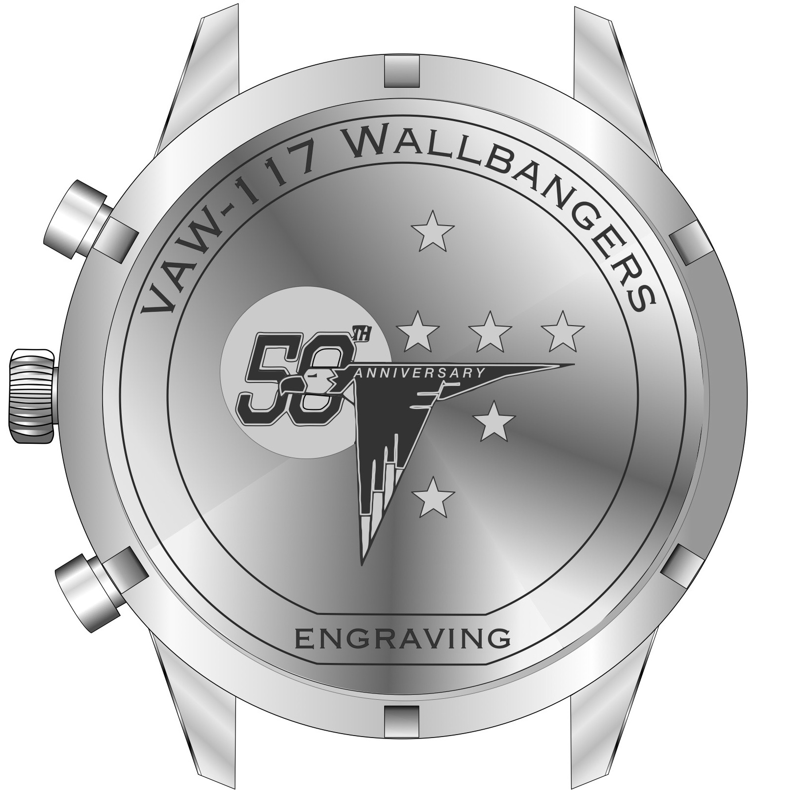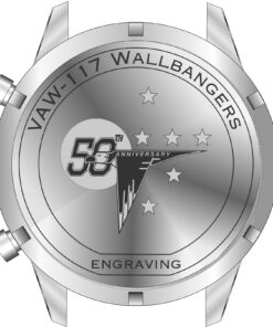 Caseback Orientation:  Please note that the caseback “design” pictured in this gallery is oriented exactly in line with the watch face for presentation purposes only.  During production, the caseback is a separate piece of the watch.  When the casebacks are engraved with the airframe design, they are not attached to the rest of the case at that time.  Since both the casebacks and cases are threaded separately, when the engraved caseback  is then screwed onto the case, the final tightening point will result in the caseback design not being in the exact orientation in relation to the watch face.  And there will be some variation from watch to watch.